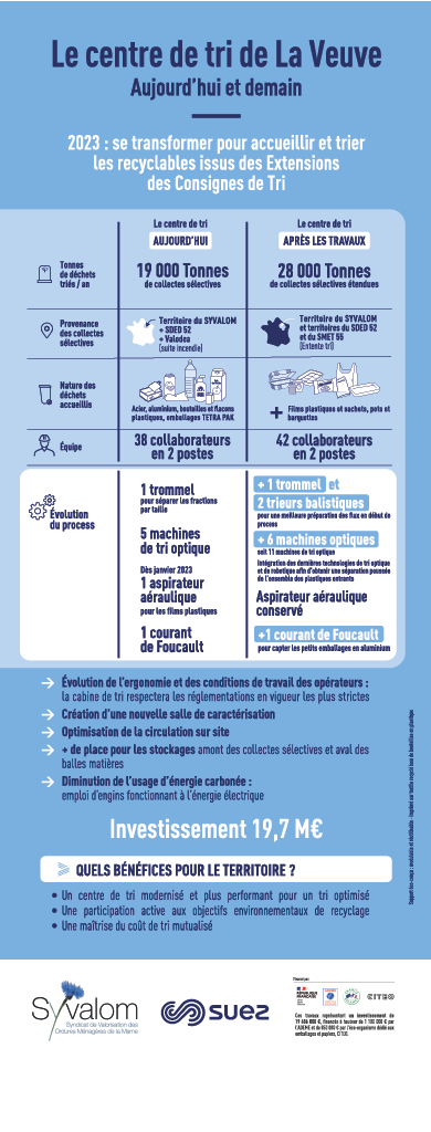 Depuis le 29 mai dernier, le Syvalom et son nouvel exploitant Suez ont engagé des travaux de modernisation de l’l’installation existante afin de trier au mieux les nouveaux emballages plastiques générés par l’extension des consignes de tri en place sur le territoire depuis le 1er janvier 2023.